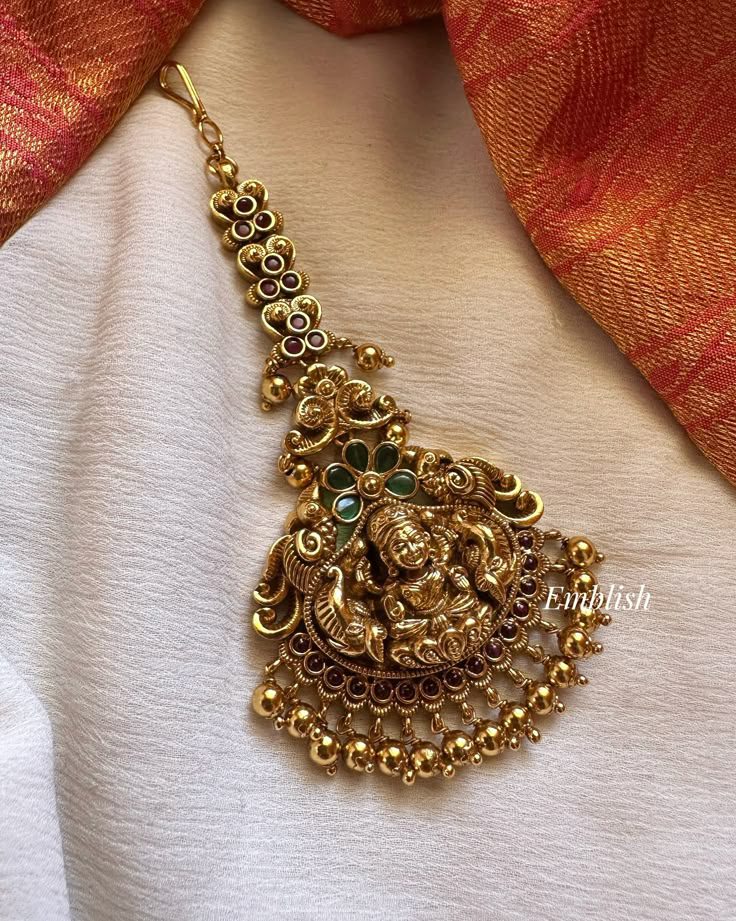 Add a divine charm to your traditional look with this Antique Lakshmi Temple Maang Tikka, crafted in an exquisite South Indian style. This beautifully gold-plated tikka features a detailed carving of Goddess Lakshmi, symbolizing wealth and prosperity. Intricately designed with floral patterns and studded with green and ruby-like stones, it is perfect for weddings, festivals, and special occasions.