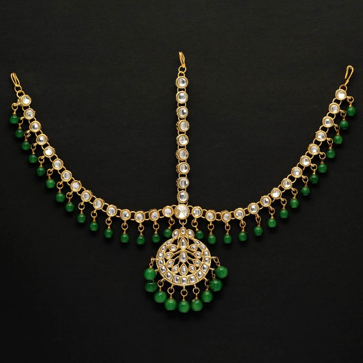 Add a regal touch to your traditional attire with this Gold-Plated Kundan Maang Tikka, beautifully adorned with vibrant green beads. This tikka features a classic Indian bridal design with high-polish gold plating and sparkling kundan stones that catch the light effortlessly. The green bead detailing adds a refreshing and eye-catching contrast, making it an ideal accessory for brides, bridesmaids, or festive wear.